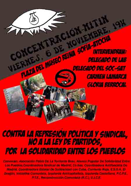 Concentración- Mítin en Madrid para denunciar la represión política y sindical, contra la ley de partidos, en repulsa por las detenciones del pasado día 13 en la sede de LAB y por la solidaridad entre los pueblos. Viernes 6 de Noviembre a las 19H en la plaza junto al museo reina sofia (Metro Atocha)